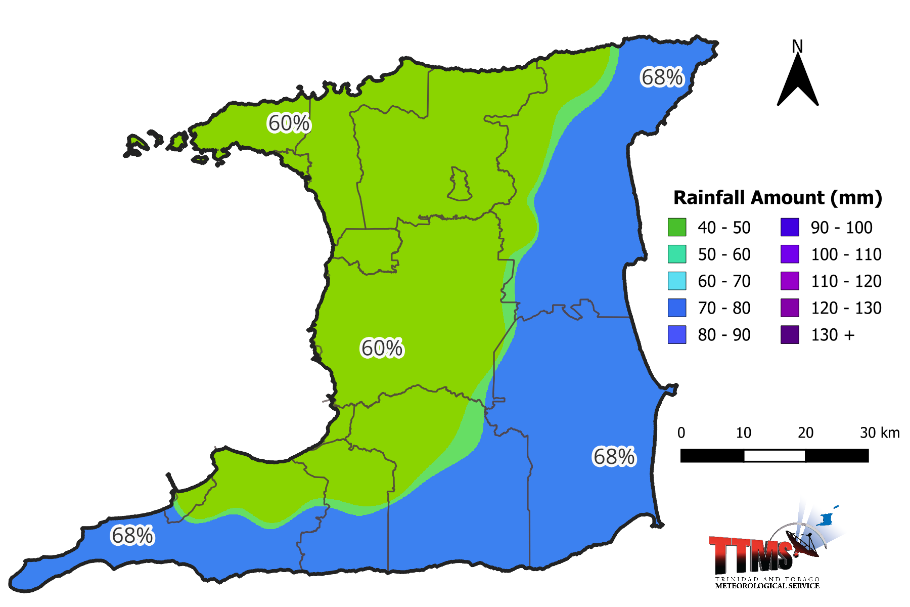| 4-15 mm of rainfall is possible | Partly to mostly cloudy, breezy, few showers particularly south Trinidad |