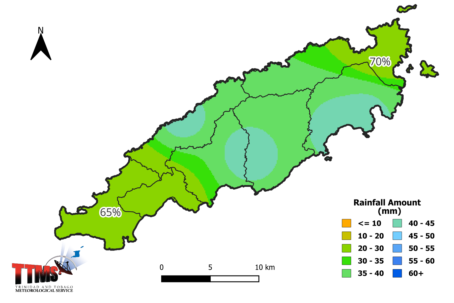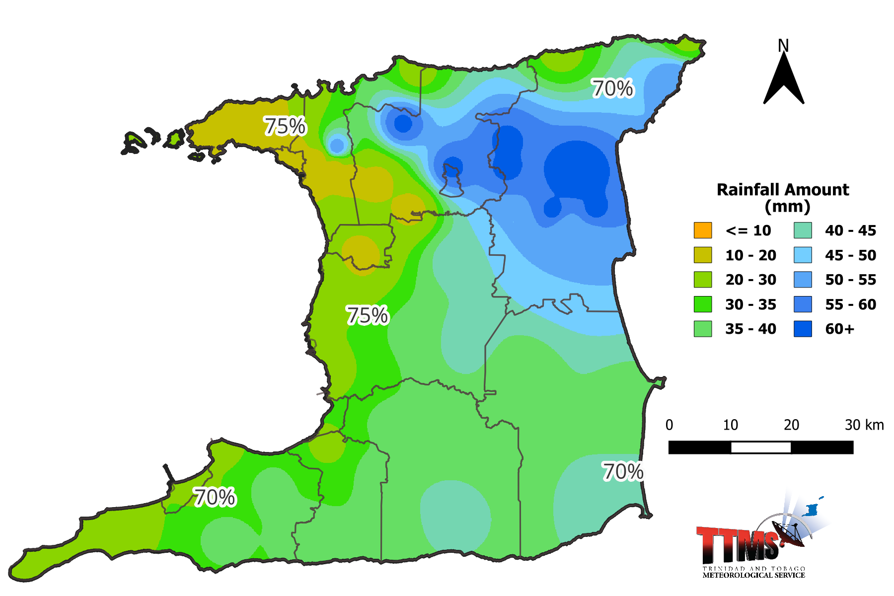 Figure 3. Rainfall map of Trinidad showing expected mean rainfall totals for districts across Trinidad during the 15-day period (16th to 31st March 2026) and percentage probability of occurrence.