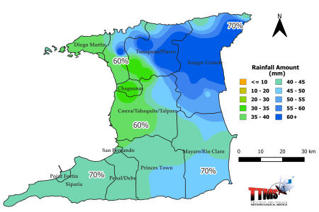 Figure 3. Rainfall map of Trinidad showing expected mean rainfall totals for districts across Trinidad during the 15-day period (16th to 30th April 2026) and percentage probability of occurrence.