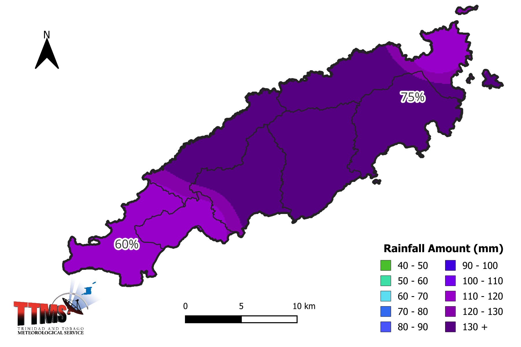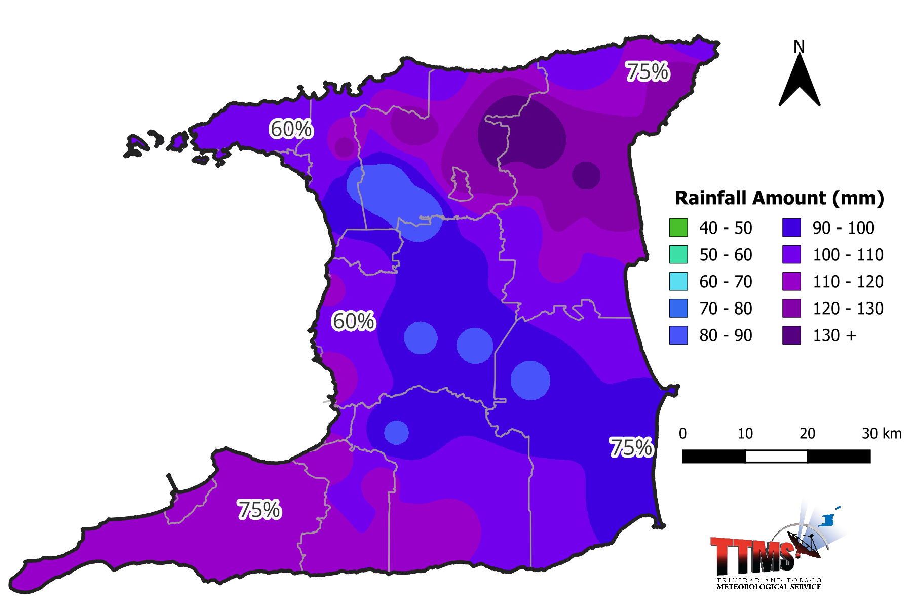Figure 3. Rainfall map of Trinidad showing expected mean rainfall totals for districts across Trinidad during the 15-day period (16th to 31stOctober 2025) and percentage probability of occurrence.