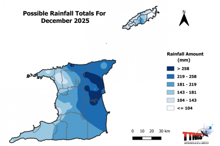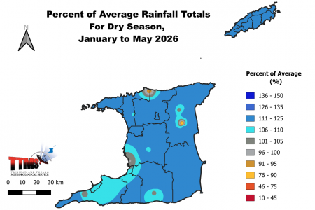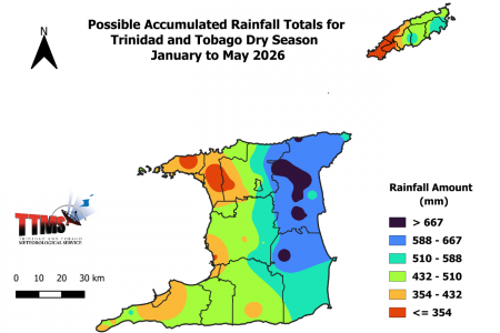 - The 2026 dry season accumulated rainfall totals for Trinidad and Tobago are likely to be the highest in northern and eastern areas in the vicinity of Valencia, North Oropouche, Sangre Grande in Trinidad and Charlotteville, Speyside, Roxborough and Glamorgan in Tobago, where the totals could range between 540 mm and 769 mm.